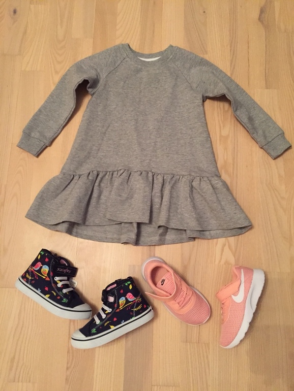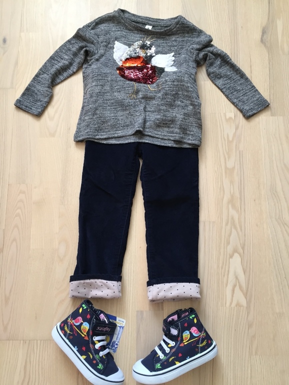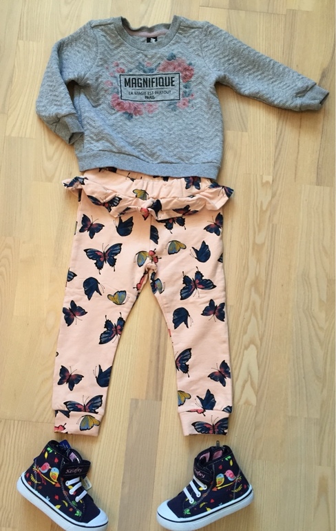 Дальше свитшоты, толстовки и пр. Синяя толстовка дино bodo, вельветовые брюки Gap и джинсы со звездами Futurino. Светлый, серо-розовый свитер и с птицей это Acoola, бомбер на молнии и легинсы с бабочками (внутри начес) - Name it. Кроссовки Demix, кеды Котофей.