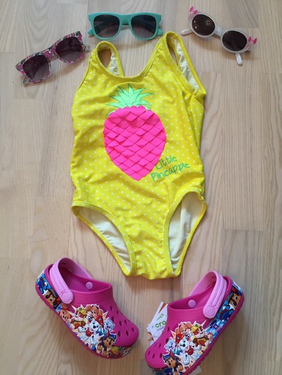 Купальник только один - Waikiki, очки HM и марку третьих не помню. Кроксы с "щенячьим патрулем", дочка их фанат)