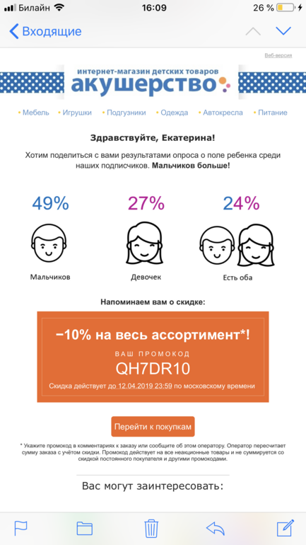 Катюня в Выбор товаров 7 лет Скидка 10% Акушерство Распродажи. Скидки. Акции. Вдруг кому пригодится) Посмотрите еще 20 записей на эту тему Отменить Ответить Анастасия Спасибо! 11.04.2019 Ответить Мечта Я вам расскажу как там же получить кэшбэк, и он будет больше 10%. Просто купить через goods.ru 😉 11.04.2019 Ответить Возврат в Дм Акция ДМ -70% на 2 вещь Чаты Беременных Выберите чат: Январята-2026 Февралята-2026 Мартята-2026 Апрелята-2026 Майчата-2026 Июнята-2026 Июлята-2026 Августята-2026