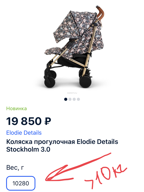 Мне кажется это какой-то глюк)). Почти на всех сайтах указан вес коляски 9 кг, а с упаковкой 10280.