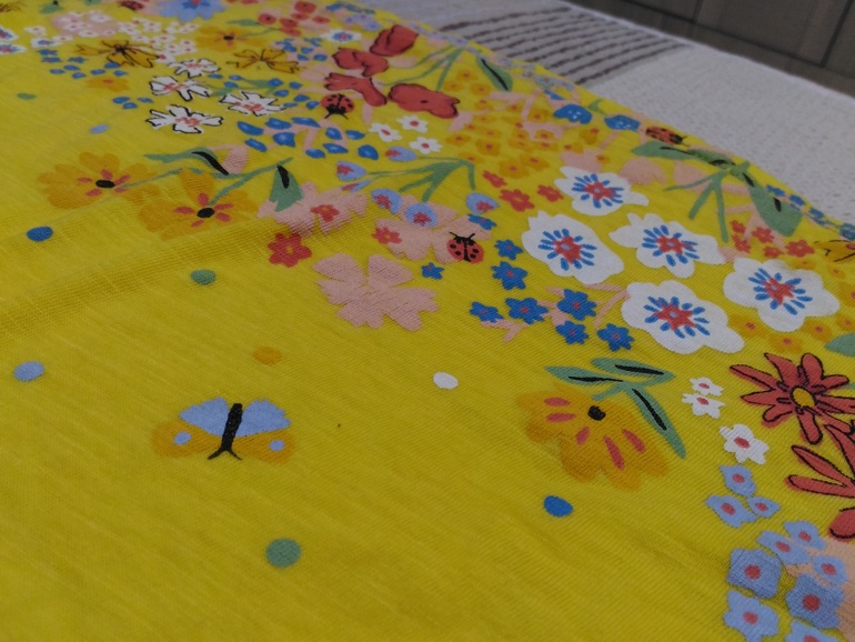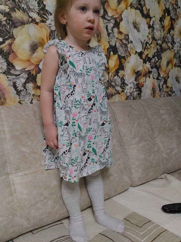 На желтом платье рисунок нанесен сверху как бы, на сером - напечатан на ткани. Дочка ростом 93 см, размер платья 98. Взяла размер побольше, чтобы попросторней было.
