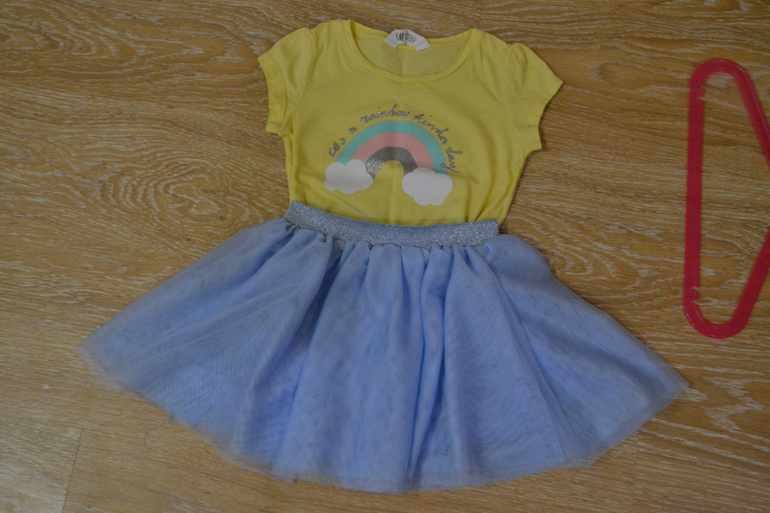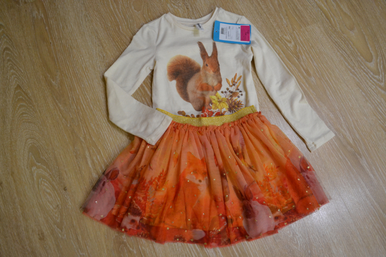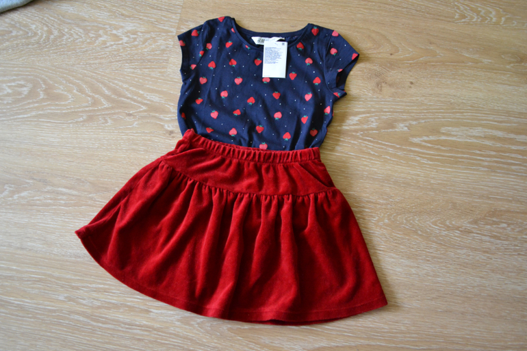 футболочка H&M, размер 122-128 нам совсем не большая, она свободного кроя, квадратная какая-то. После стирки снизу не равномерно деформировалась. Но в носке незаметно. юбка тоже H&M, ее давно показывала уже.