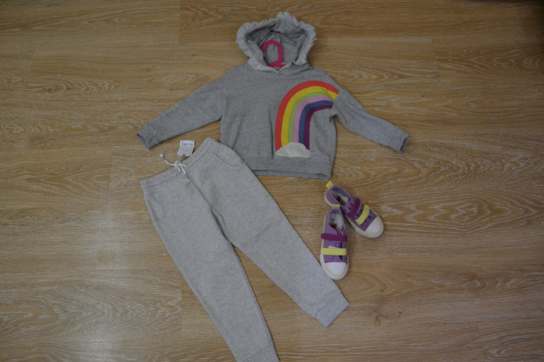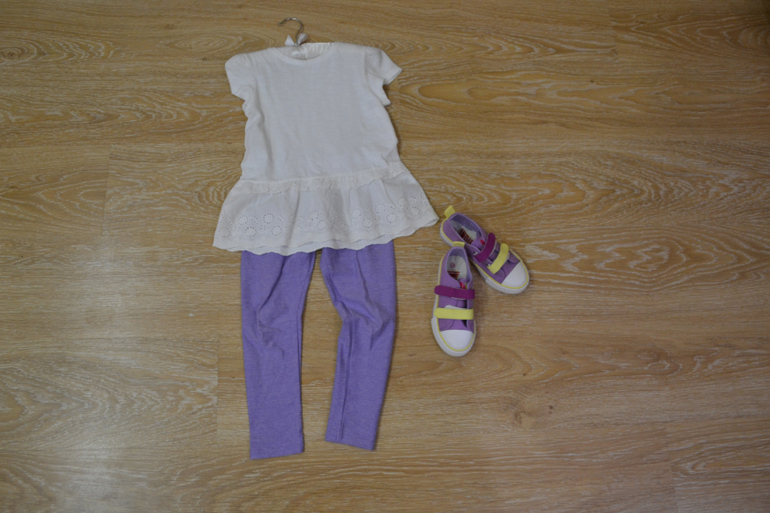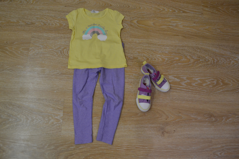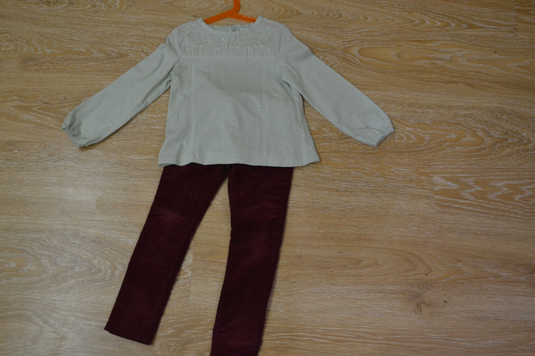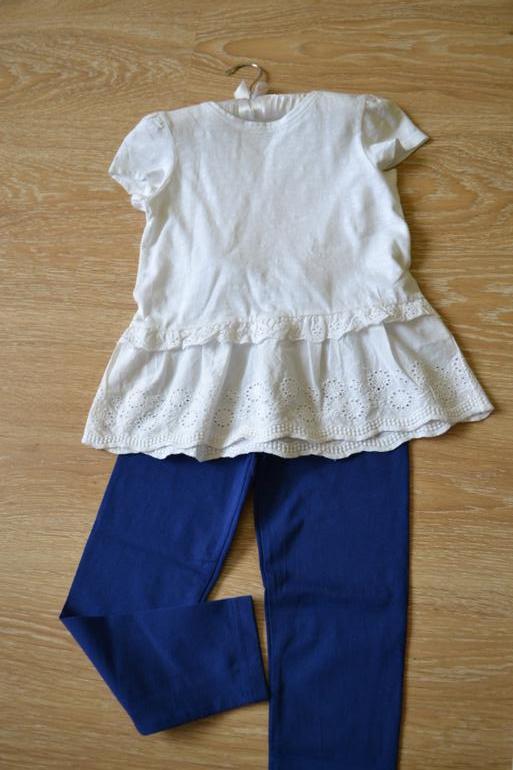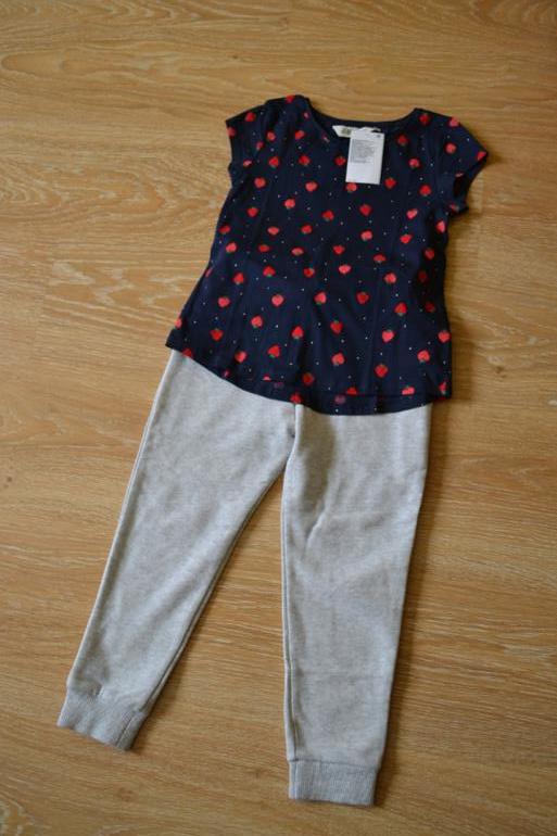 футболочка H&M, тоненькая очень, 110-116, на 110 впритык. И еще села после стирки. Лосинки Некст размер 116, плотные, хорошие))