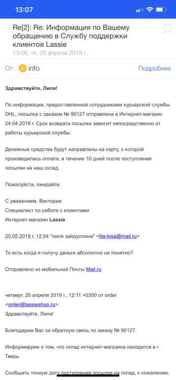 Черный список и жалобыДобрый день!хотела предупредить остальных,так как сама столкнулась с таким впервые.я большую часть вещей заказываю своим детям онлайн как и многие здесь,стараюсь оплачивать при получение,но иногда делаю предоплату,если так выгодней. с возвратами или отменами заказов до этого проблем никогда не было.увидев акцию в lassieshop заказала детям комбинезоны и шапки на осень в сад,оплатила онлайн для получения доп скидки 16 апреля,но случайно увидев что в другом магазине цена получалась меньше,отменила заказ через 40 минут в этот же день у их оператора.как оказалась моя отмена их не волнует и они таки отправили заказ транспортной компанией.в итоге после кучи звонков и писем на их почту,его отменили,но теперь надо ожидать поступление заказа обратно в магазин и только после этого в течении 10 дней они отправят мне мои средства.и все бы ничего,но заказ уже 10 дней лежит на складе транспортной компании и не известно когда отправится обратно в магазин.ни переписка,ни звонки каждодневные результатов не дают.ответ один-Ждите,а сколько не известно.с такой бредовой системой сталкиваюсь впервые,но желание делать предоплату отпало навсегда