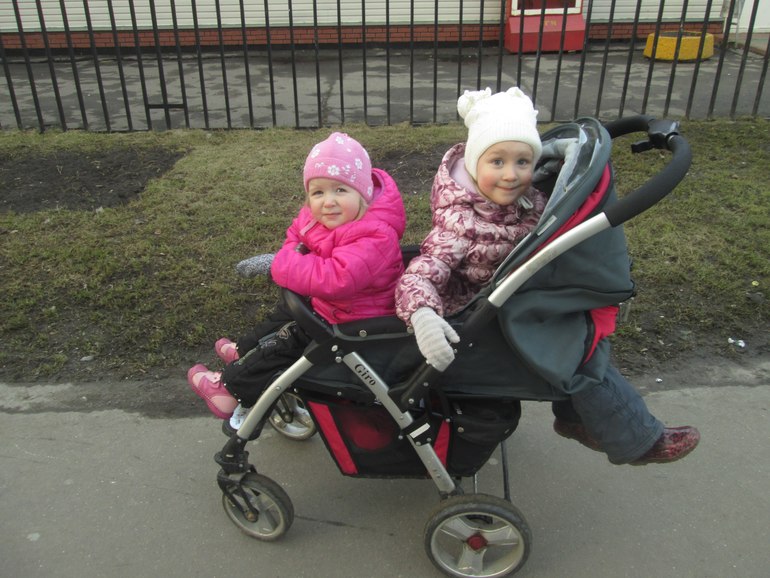 Извините, а зачем засовывать двоих как селедок, если этого моно избежать, и для селедок специально придумали удобные двойные коляски? :-)