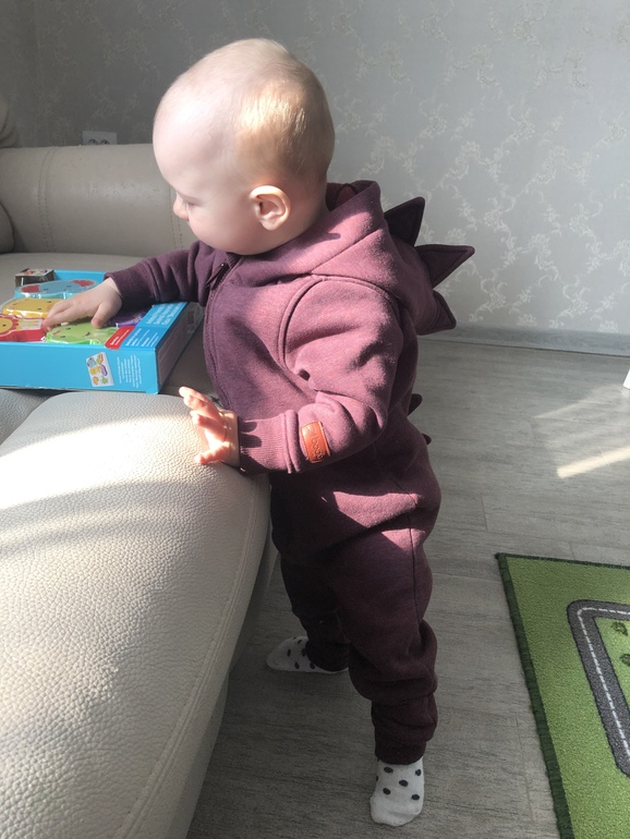 У нас толстовка с дино, с прошлого лета. Выглядит как новая. Размер 98-104 как раз и сецчас. Ребенок 102 рост вес 16 кг.
