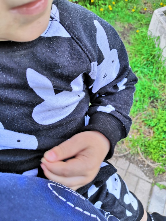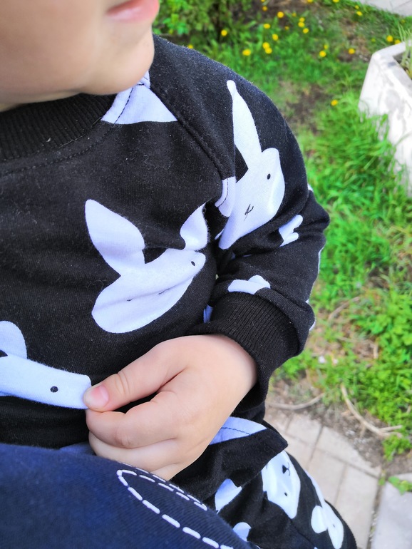 После первой стирки в супер щадящем режиме белые зайцы окончательно посерели...ну, собственно, все ясно по фото.. Если что, дочка его не носила, я просто постирала новую вещь перед тем, как одеть дочку
