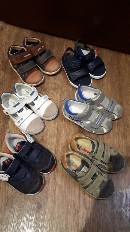 Много однотипных ботинок. У нас обычно одни такие кожа на коже, две пары кед ( на случай стирки, активно их носим), одни закрытые сандалии и сандалии крокс. Думаю покупать ли открытые кожаные, прошлые года обходились.