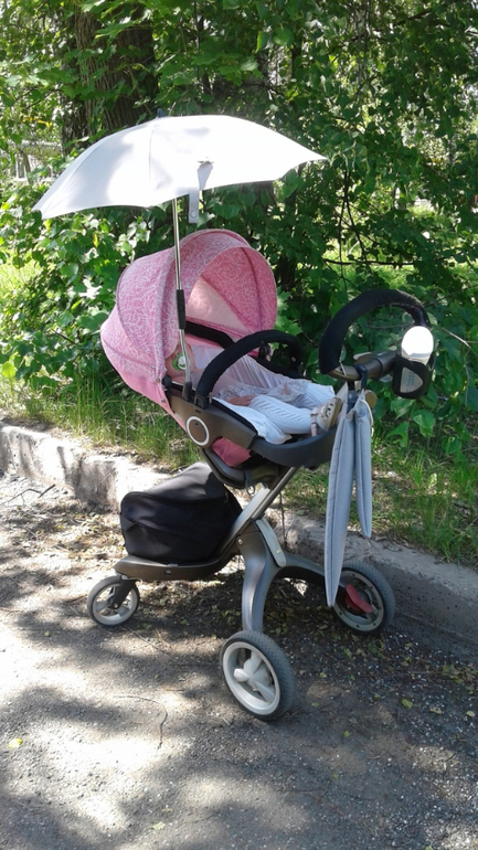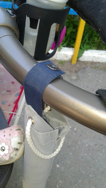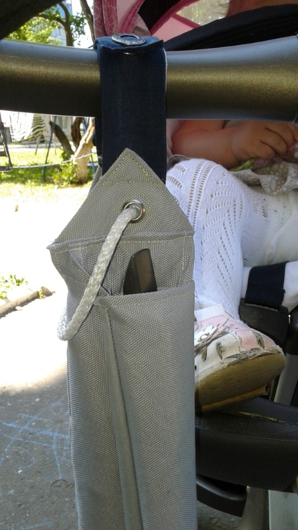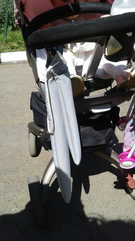 Аксессуары и доработки колясокНе знаю где народ держит зонтики от коляски,но в сумку для покупок он просто не влазит(((А если в магазин еще сходить,то в сумке совсем места не остается для зонта,да и марается он при такой вот экслуатации.Можно оставить его болтающимся на коляске в сложенном виде,но меня это не устраивает.Вобщем я была очень разочарована-этот момент с зонтом совсем не продуман,его просто некуда положить на прогулке(из сумки он торчит как ни крути☹️).Решено было сшить простецкий чехол,который будет пристегиваться к ручке коляски,либо к бамперу. Порывшись у себя в закромах(этих закромов к слову стоит целая огромная коробища)нашла чехол для обуви,который не использовался и использоваться не будет уже.Приложила зонт,обвела и вырезала два чехла-для зонта и для переходника.Сшила их вместе,прикрепила веревочку и прикрепила хлястик с кнопкой.И вот что получилось... Результатом я довольна.Теперь зонт не торчит из сумки,не качается на коляске,а просто висит на бампере или на ручке.За колеса не задевает(хотя,если опустить сиденье в самое низкое положение,то наверно будет)никому не мешается.Вобщем я довольна как слон и удивлена,что такой известный и не дешевый производитель детских товаров не продумал этот момент(хотя,возможно это просто мои заморочки и других вопрос этот не волнует)