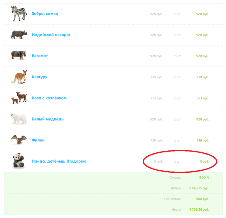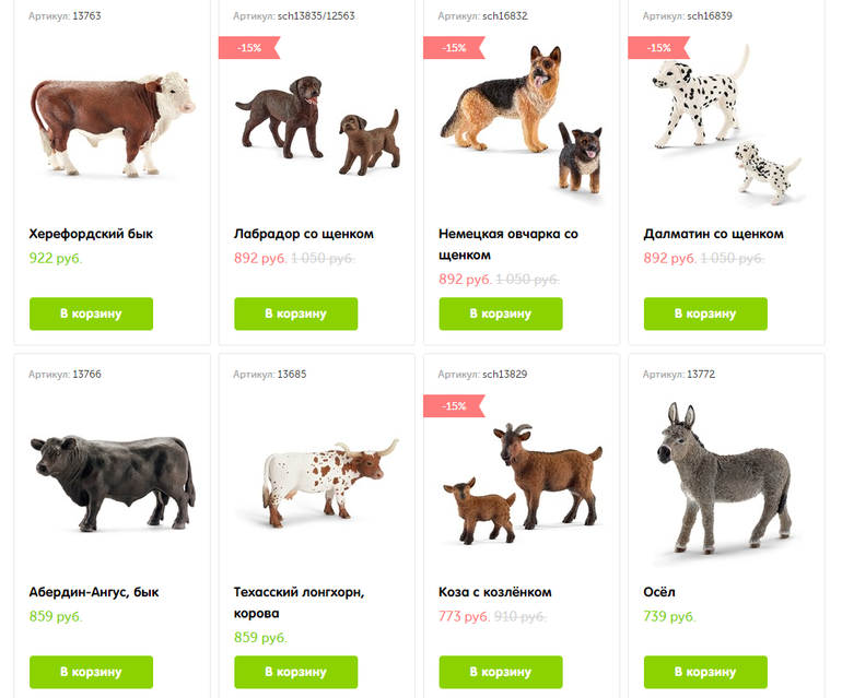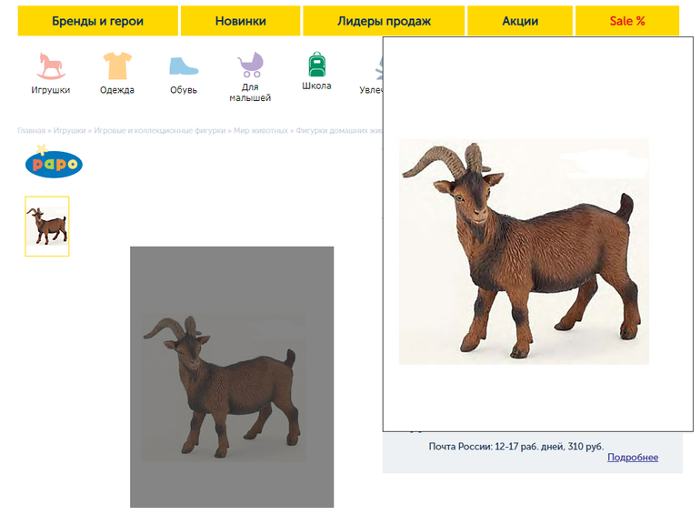 На этот раз возьмём козу и козлёнка. На эту парочку скидка 15%. Итак: 773 - 29% - 15% = 432,88 рублей. И это фактическая цена за 2 фигурки! Плюс во многие регионы доставка бесплатная от 4 000 рублей, а это значит, что можно получить одну фигурку бесплатно!
