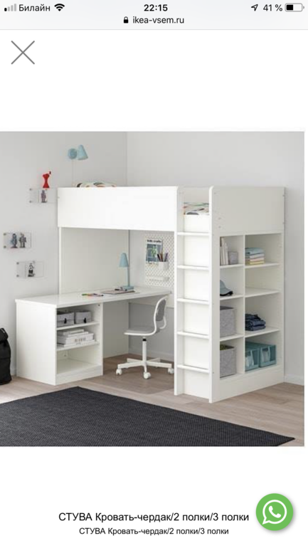 У нас была Стува именно как на вашем фото, продали лестница на верх не удобная, дочь не любила по ней забираться, я как-то сама чтоб постель перестилать туда забиралась тоже от лестницы осталась не в восторге . Сын вообще туда лезть отказался. Купили Сканд из серии Актив сыновьям двухъярусную, она модульная можно вместо нижней кровати к чердаку стол поставить, дочь в свою комнату диван выбрала.