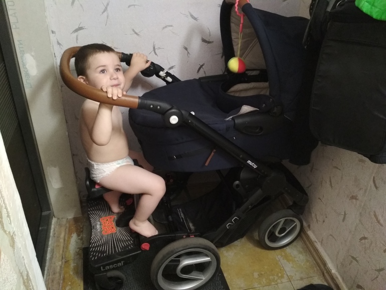 Сейчас старший чаще на самокате. Но может устать и проситься в коляску. Может и уснуть, если совсем утомился, но это редко.