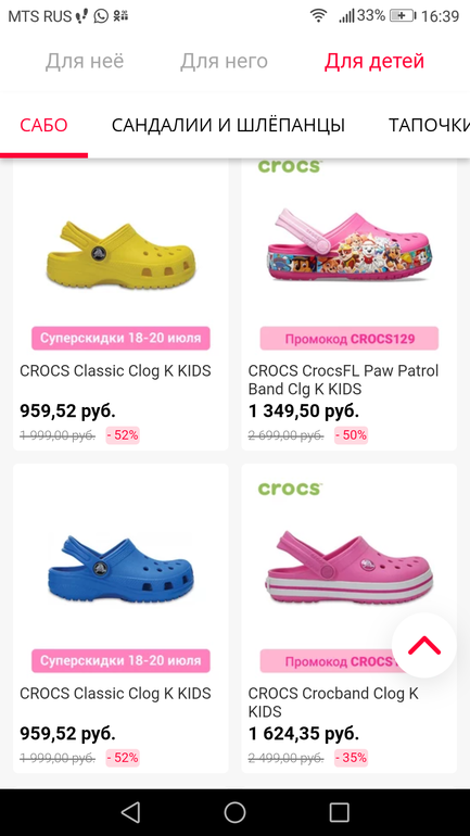 Детская обувьПока обладатели малышковых размеров выносят вайлдберрис, сообщаю, что на Тмолле тоже распродажа кроксов, да еще и доп.скидка 10%. Размеры есть все.