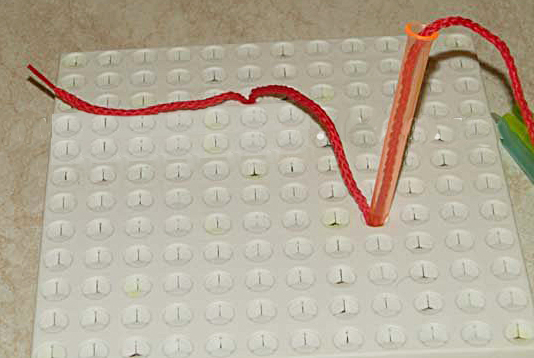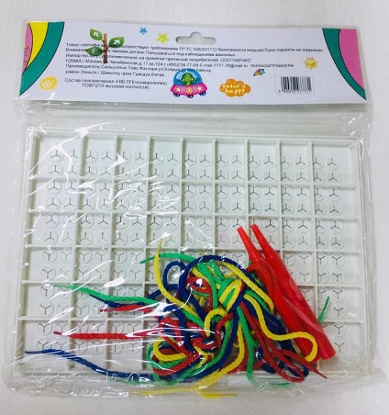 В наборе что я ищу есть ИГОЛКА специальная и специальная доска-основа, выполненная из мягкого пластика. Каждая дырочка - закрыта тремя мягкими лепестками. При введении иголки лепестки мягко расходятся, пропуская ее кончик со шнурком на изнаночную сторону. А при вытягивании обратно сжимаются, фиксируя петельку шнурка.