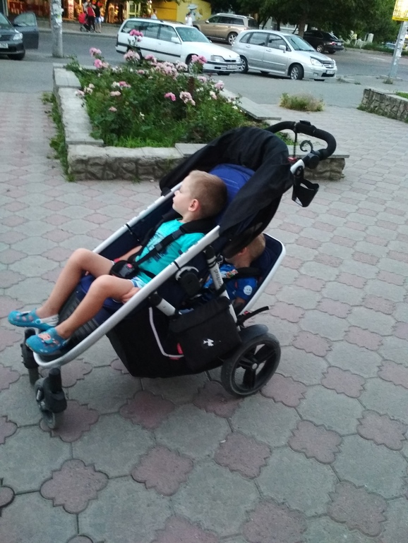 Детям старшим 4.1 и 2.1 года. Сейчас в ней ездит младшая парочка погодок 2.1 и 5 месяцев, но если мы уходим на весь день или едем на отдых, то старшая парочка тут по-прежнему катается, потому что у всех ещё есть дневной сон около 2.5-3 часов.