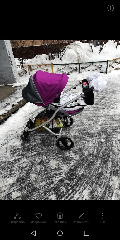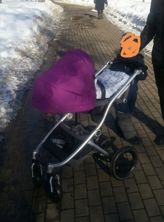 Потом вышли на улицу, март выдался очень холодным и снежным. Оказалось коляска по снегу едет и очень даже хорошо, могу это точно сказать, так как откатали уже полностью зиму.