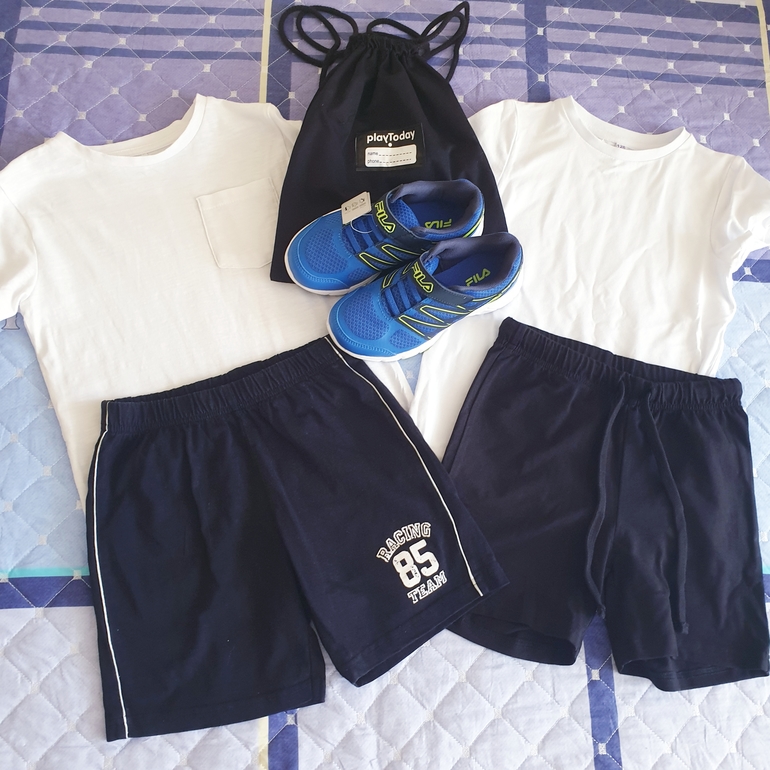 Белая футболка и тёмные шорты для зала. У нас 2 комплекта- один ещё с лета остался. Второй купила в Плей Тудей (вместе с сумкой)))