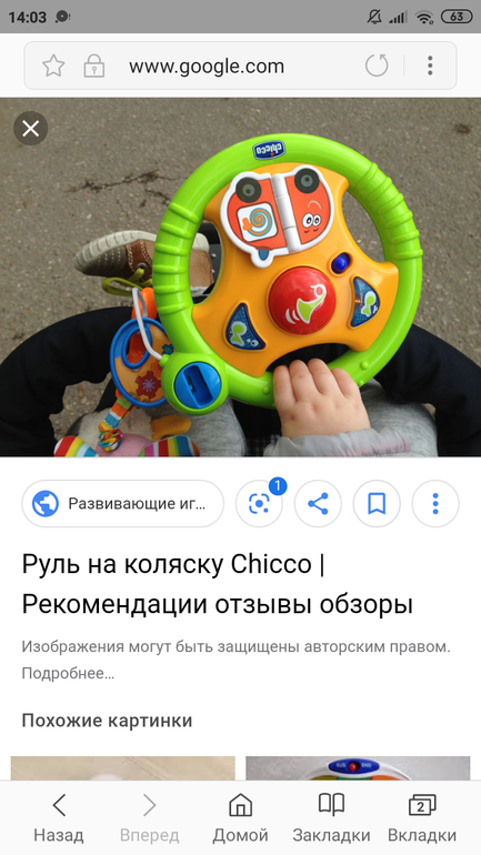 Руль Chicco. Крепится на липучки между ножек на ремень коляски "намертво". Все 3 ребенка его любят.