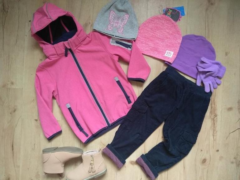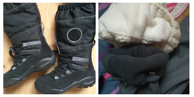 Слитник 60гр остаётся, с термо/флисом. Куртка на синтепоне, полукомбез 60гр, брюки и джинсовый комбез на флисе. Шапки с подкладкой , шлем хб (на фото только новое, куча шапок от старшей ещё). Варежки демисезон на флисе. Полуботинки без утепления с тонким шерстяным носком. Ближе к +2+3 наденет дутики, наверное.