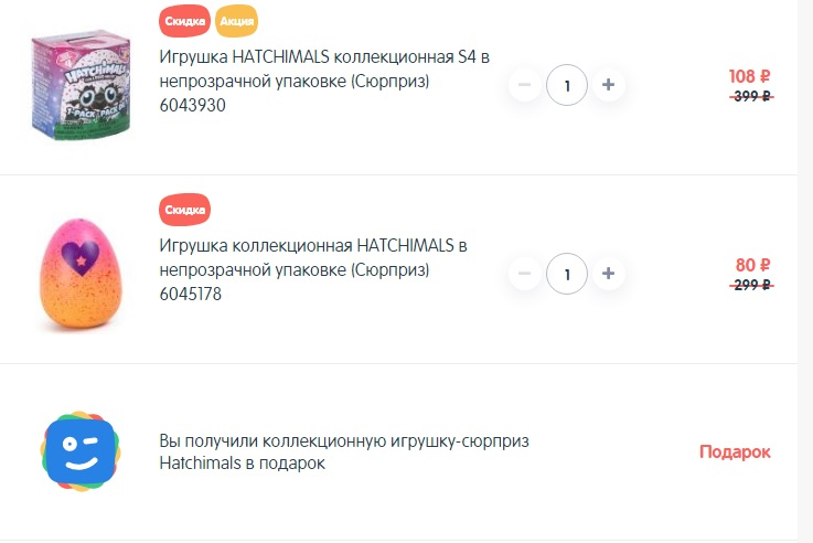 При покупке любого яичка HATCHIMALS, это яйцо ( арт 6045178) идёт в подарок (добавить в корзину), скидка распределяется на все товары. Более подробно про акцию на сайте не нашла. Там подарки идут на многие товары этого бренда, только это один вид подарка или несколько? Не разобралась