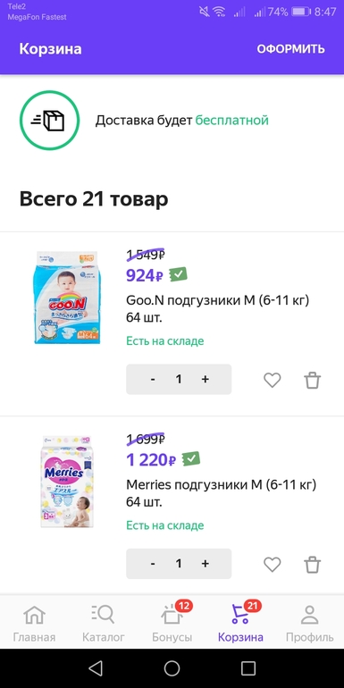 Я пару недель назад делала пост. Каждый четверг, кажется, они выпускают купоны, на подгузники не каждый раз, но тоже часто бывает там. Плюс к ним применяется промокод. Плюс новым клиентам купон 500 рублей. В итоге такая цена. Отслеживать можно на соседнем сообществе, там девушка всегда сообщает о появлении новых купонов.