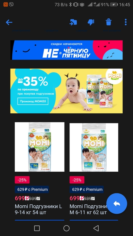 Не знаю, может кто-то писал уже.. 35% скидка на подгузники MOMI по купону momi35. Даже без баллов отличная цена) я взяла 2 упаковки по 44 шт за 608 р (300 баллов за нури)
