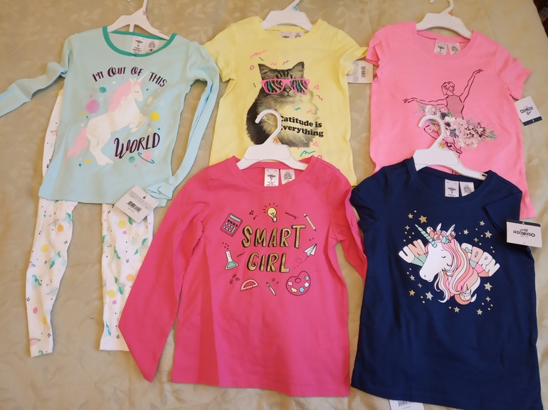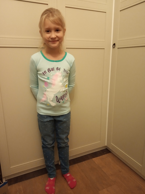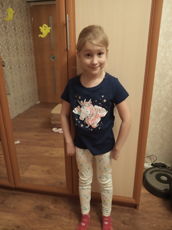 Пижама 6, футболка 4-5, остальные футболки 7, показались огромными, убрала, потом решили померить, оказалось, что не так сильно велики, как мне показалось