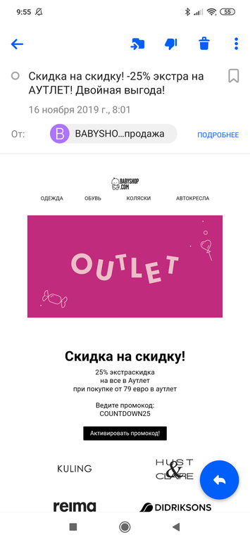 Мария в Выбор товаров 6 лет Бебишоп Распродажи. Скидки. Акции. https://m.ru.babyshop.com/%d0%b0%d1%83%d1%82%d0%bb%d0%b5%d1%82/s/627?sc_src=email_124893&sc_lid=9007131&sc_uid=DsKevNeo7w&sc_llid=11895&sc_eh=7b45c58c9a436fc51&utm_campaign=CIS_20191116_25offoutletbrandsandcategories_COUNTDOWN25_notpurchasedlast10days&utm_source=crm&utm_medium=email&utm_term=%D0%90%D0%BA%D1%82%D0%B8%D0%B2%D0%B8%D1%80%D0%BE%D0%B2%D0%B0%D1%82%D1%8C+%D0%BF%D1%80%D0%BE%D0%BC%D0%BE%D0%BA%D0%BE%D0%B4%21 Посмотрите еще 20 записей на эту тему Отменить Ответить Marina Не проходит у меня на товари аутлет промоеод,что делаю не так😫 16.11.2019 Ответить Мария Ссылку вставила, посмотрите, возможно, только на определённые товары? 16.11.2019 Ответить Marina Спасибо,заработала) 17.11.2019 Ответить Happy Berry Странно, не проходит Промик( 16.11.2019 Ответить Ешка Проходит, но на товары из outlet 16.11.2019 Ответить Зимние скороходы на вб Какая хорошая скидка на Картерс? И когда ждать? Чаты Беременных Выберите чат: Январята-2026 Февралята-2026 Мартята-2026 Апрелята-2026 Майчата-2026 Июнята-2026 Июлята-2026 Августята-2026