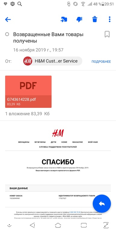 У меня это был первый заказ в H&M и не единственный в магазинах. Не везут, думаю.. Мало ли.... Потом забыла вообще про них. Недавно вспомнила, что заказ не привезли, а как искать? Ни трека, ни номера заказа нет. Думаю, значит не хватило мне акционных вещей. И вчера письмо это приходит. Все равно в заказе вещей 10 было, а положили 4 и те не привезли