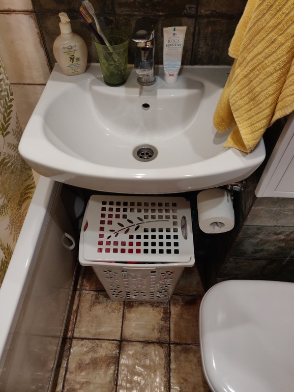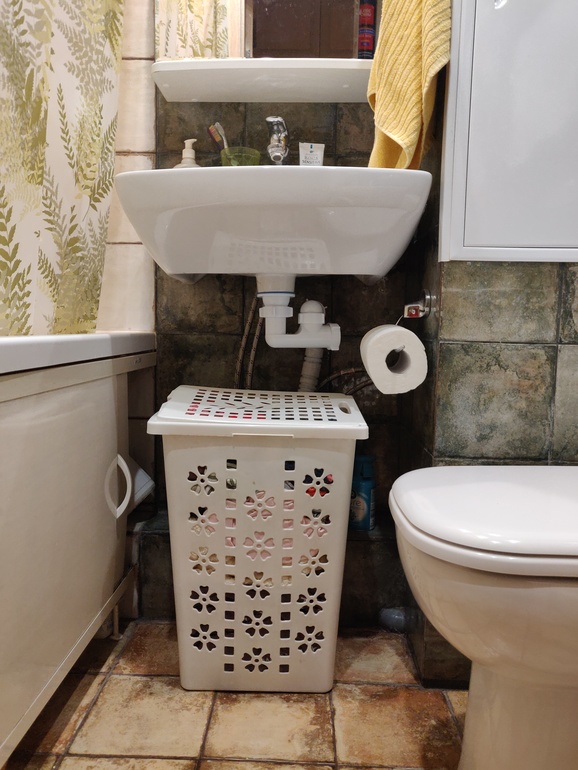 Раковина высокая, кран короткий, не двигающийся, лесенка проступку поставить некуда. Удобно использовать как приступку корзину для белья, я, разумеется держу ребенка со спину и мою ее ручки. Но сегодня это удобно, потому что я меняла постельное белье и она полная.