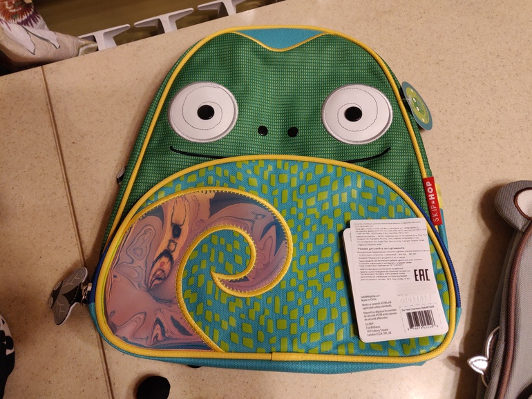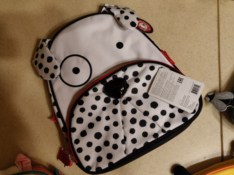 Еще взяла меленький рюкзачок. Он от года, но будем носить его наверное уже весной, с двух лет. Расцветка спорная для девочки, но я забрала последний, выбора особо не было. У нас есть красная курточка. Возхможно с ней будет хорошо смотреться. У этого рюкзачка есть поводок, но не уверена, что буду пользоваться такой штукой. Все-таки чисто психологически спорная для меня вещь 🙂