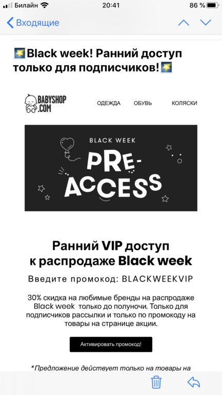 На товары с этой страницы https://m.ru.babyshop.com/pre-access-code/s/2236?sc_src=email_141925&sc_lid=9472473&sc_uid=Q8GJZSmOHo&sc_llid=1726&sc_eh=33818a20680b72e91&utm_campaign=CIS_20191124_Black+week+PRE+ACCESS_BLACKWEEKVIP&utm_source=crm&utm_medium=email&utm_term=Активировать+промокод%21