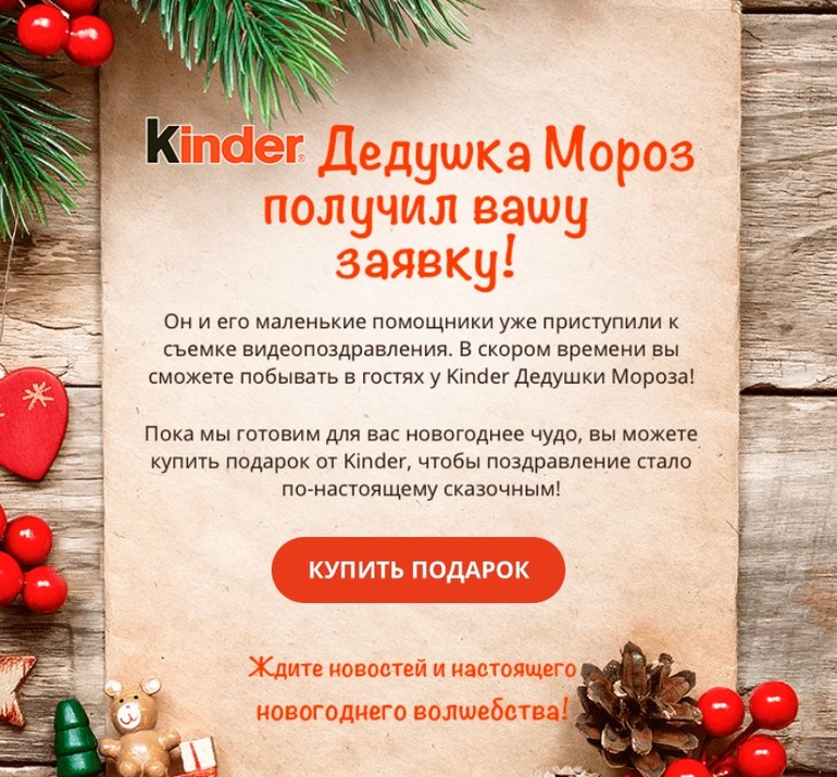 Я тоже оформила заявку на сайте Киндера). Анкета очень понятная, в ней можно указать имя ребенка, достижения за год. Письма на почту приходят очень быстро. Все оказалось очень волшебно!