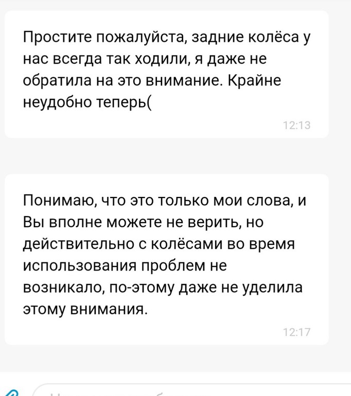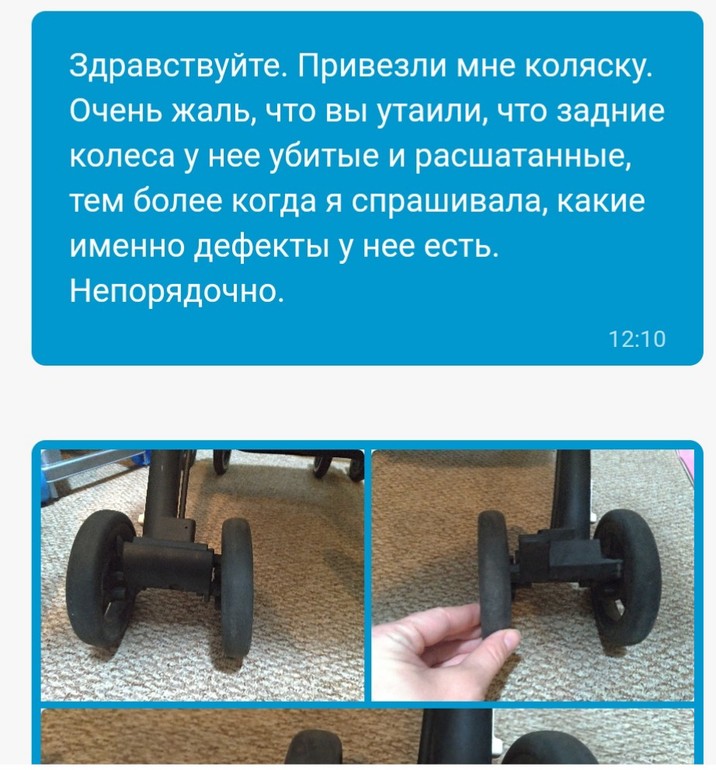 Ань, я бы написала. Пусть хотя бы человек за своё враньё испытает пару неприятных минут. А ещё лучше вернут сумму , достаточную на ремонт колёс. Это же явный износ коляски🤷♀️
