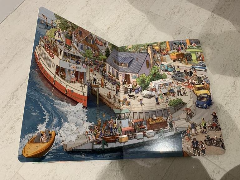 Виммельбух «на реке». Из этой серии у нас был цирк (он лучший там). Хорошая цена 600-700, но взяла за 760 на озоне, тк давно ниже не опускалось.