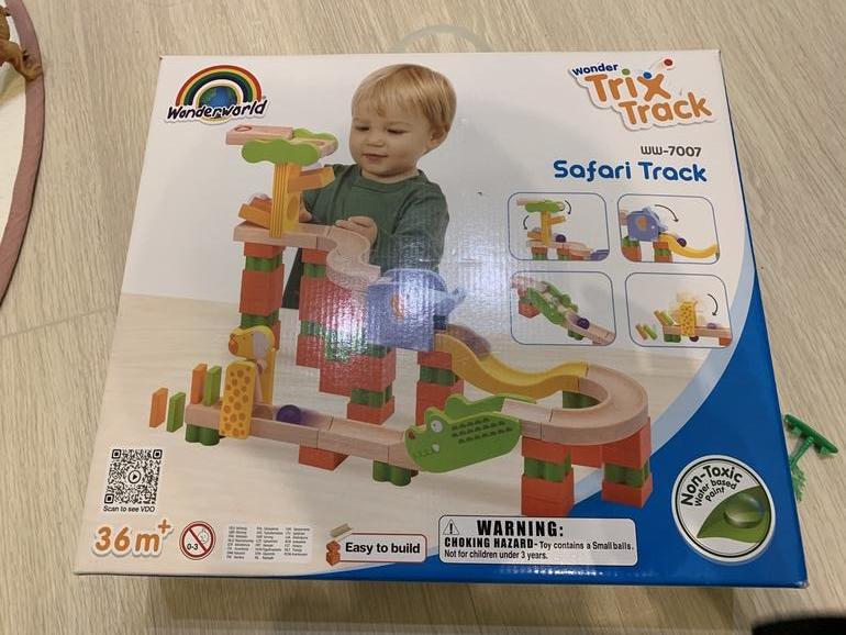 И запакованным стоит вот деревянный трек. Он пойдет точно, тк стыкуется с нашим, в который играют каждый день. На фото наш, его точно рекомендую. Хорошая цена 2700.