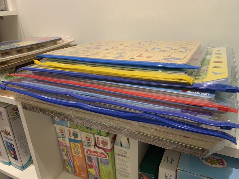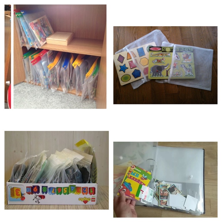 Пакеты из икеи с зип-застежкой самого большого размера, он больше а4, но меньше а3. Вообще многие игрушки и почти все развивашки храню в таких пакетах из икеи разного размера