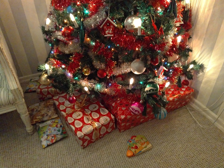 Мы к бабушке с дедушкой сьездили (на клавиатуре в самсунг не могу найти твердый знак😂, если он есть, подскажите где?!) на ужин. Приехали, пока дети руки мыли, дм метнулся за подарком🤣🤣🤣 и под елку их сложил, елку включил, свет выключил.