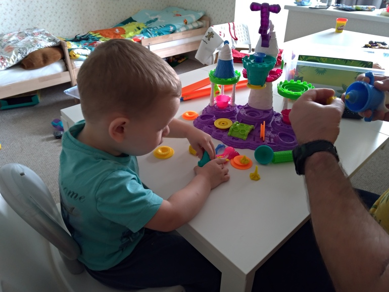 Макс целый день увлечённо собирает лего, Даня тестирует автомат и машину, даже к бабушке в гости её брал.