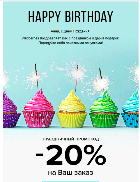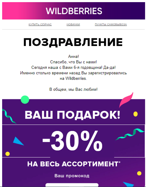 Еще могут присылать промик к годовщине регистрации, правда не знаю, как с новыми аккаунтами, моему в прошлом году 5 лет было, прислали, были ли в предыдущее время - не знаю, я была неопытный пользователь, все письма вб у меня в спам уходили 😅