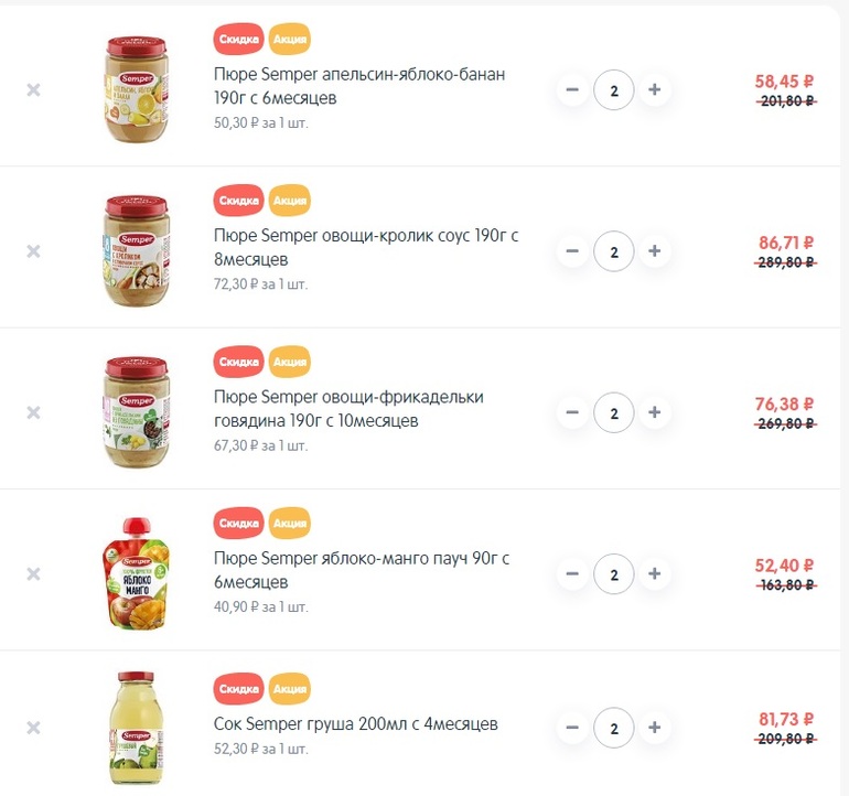 В интернет-магазине "Детский мир" действует скидка - 50% на всё детское питание Semper и каждый второй товар в подарок.
