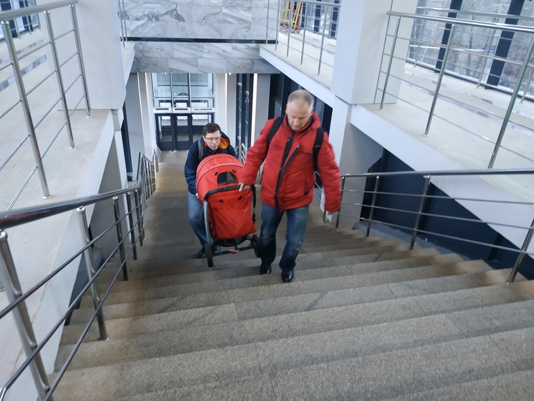 При выезде в город часто с колясками приходится делать так. И не всегда есть помощники. На фото прогулка весит 6 кг, а прогулочный блок с колёсной базой польской 14 кг. Бордюры, крутые пандусы, порожки - не понравилось езда коляски.