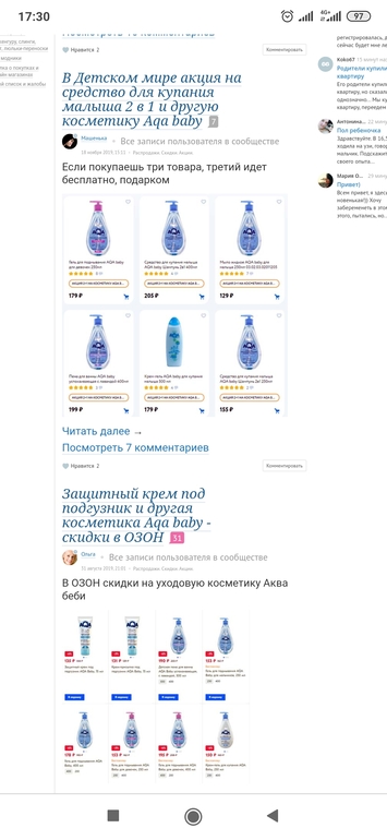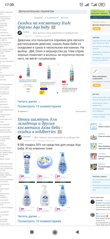 Вы, похоже, сами и не пользовались аква беби, раз пишете про запах. Не пахнут средства навязчиво и противно, во всяком случае те, которыми пользуюсь. И что вы нашли необычного в посте о скидках, написанном в том разделе, который для этого предназначен? Такое ощущение, что вы специально отслеживаете эту марку и считаете. Обо всех марках пишут часто и много, вас это не смущает ни разу? Только мой пост заинтересовал? Так идите себе мимо, если не нравится эта косметика