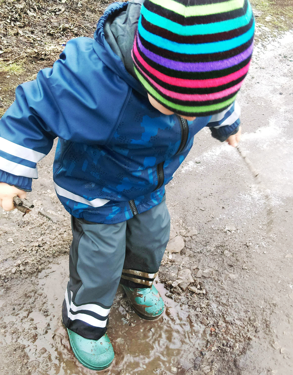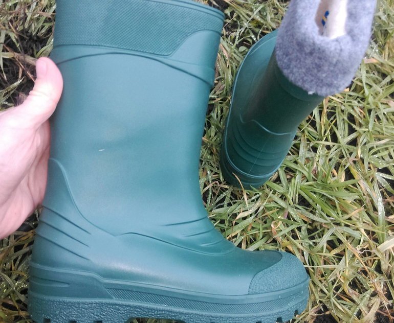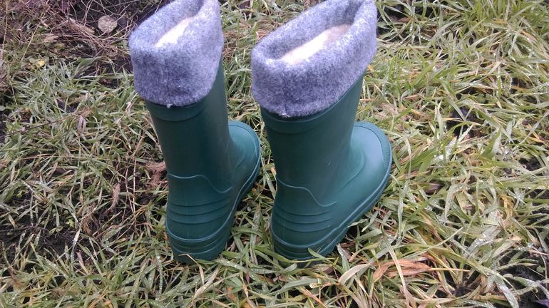 Сапоги носим если температура не ниже -1, -2, то есть, когда есть влага или лужи. Если на улице мороз и сухо, не вижу смысла надевать резиновые сапоги, нога, может быть и не замерзнет, но я предпочитаю, надеть зимние мембранные ботинки.