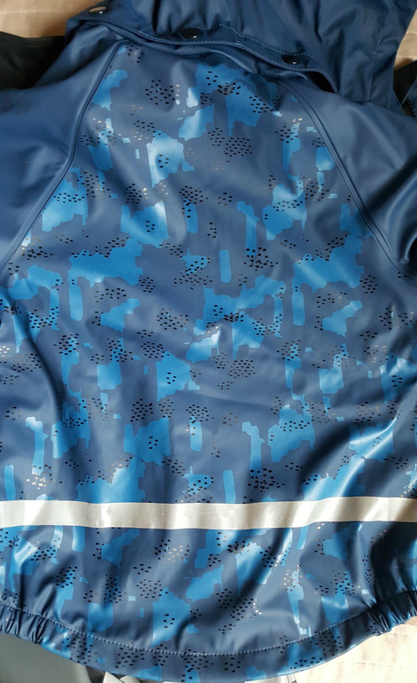 Гуляли в комплекте в дождь, грязь, все в порядке, он не промокает. Грязные штанины легко стираются, и быстро сохнут. Куртка сохнет дольше из-за хб подкладки, но ее часто стирать и нет необходимости.