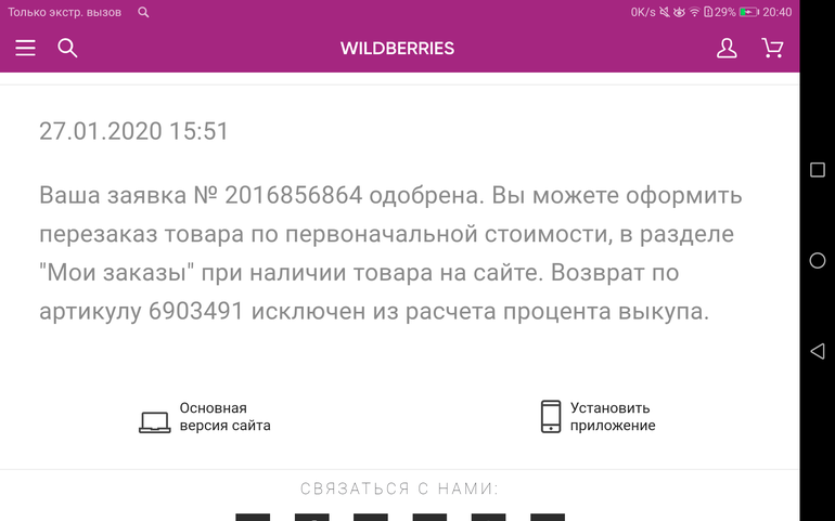 Интернет-магазины России и стран СНГМожет кто-то тоже был не в курсе. Оказывается на ВБ когда отказываешься от товара по браку или неправильному вложению (там в течение суток надо создать заявку с фото по определенным правилам чтобы не снижался процент выкупа из-за отказа) - можно перезаказать по той же цене если товар все ещё в наличии. В разделе "Мои заказы" именно для этой позиции будет кнопка "перезаказать" и та же цена, по которой заказывали первоначально, а не та что на сайте в данный момент.