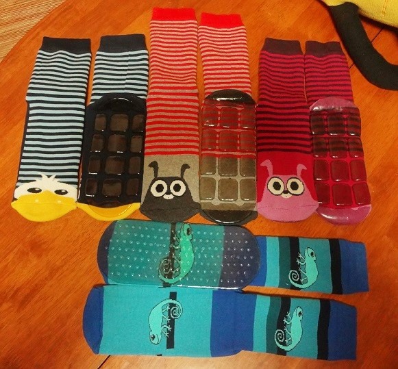 Здесь читала лайфхак - можно сделать самим эти антискользяшки на обычных носках с помощью клеевого пистолета, только перед нанесением клея надо растянуть стопу.