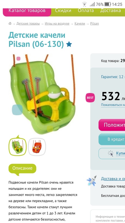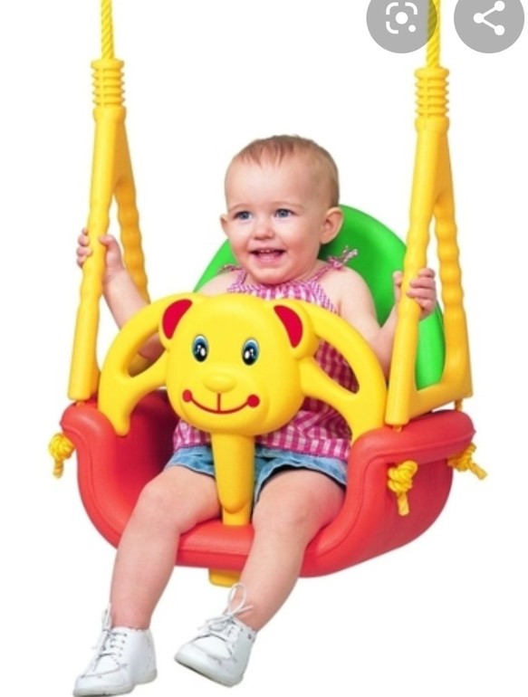 я опасаюсь качелей такой конструкции, где то читала отзыв, что ребенок качался на таких качельках, резко откинулся или спинка была плохо закреплена, спинка отвалилась и ребено сильно ударился о пол. Пожтому я за цельнолитые типа таких. вот как на фото у нас в деревне висят, третьего ребенка в них качаю и все ок, там и без ремней нереально самому вылезти или выпасть