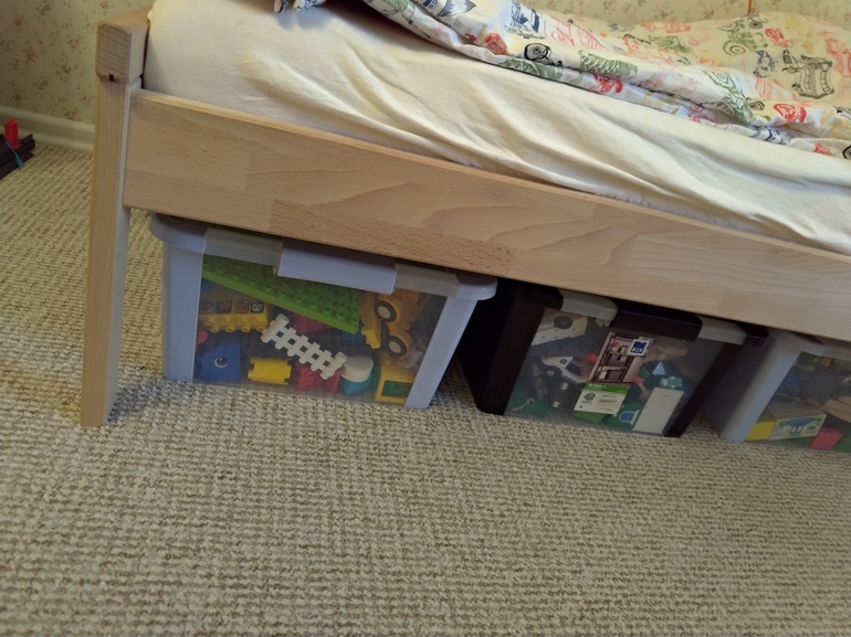 У нас тоже 3 пластиковых ящика стоят, но помимо них обязательно пару-тройку машинок, кусочки Лего появляются и ещё что то и каждый раз матерюсь когда пол мою и это все достаю.