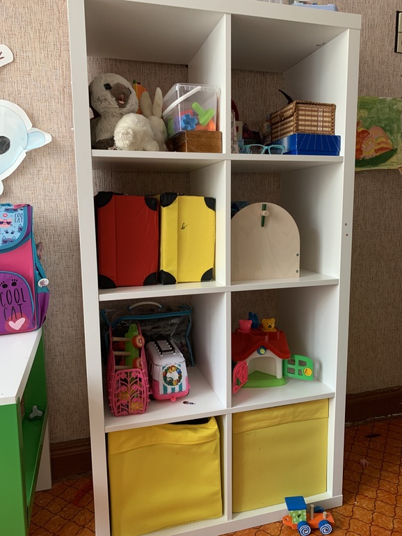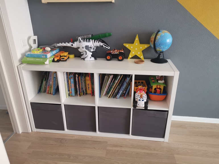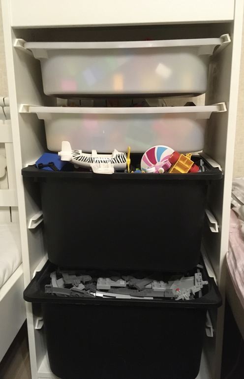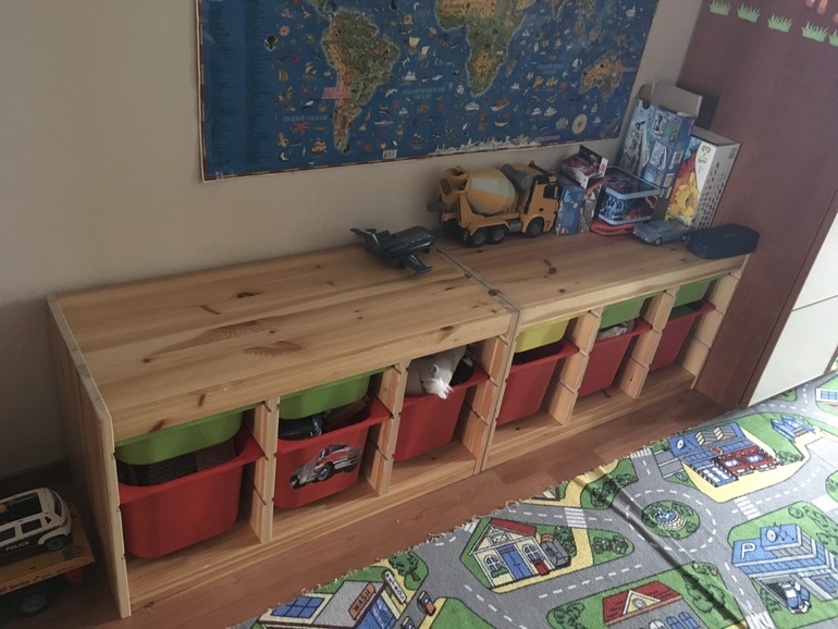 У нас такая система уже 8 лет. В идеале. Ящики не сломаны. Игрушки все разложены. Бывает, что в спешке положили что-то не туда. Но чаще всего раскладывают по своим ящикам. Удобно. Сами достают и убирают. А длинная поверхность для игр. Сейчас небольшой бардак. Обычно вся поверхность пустая